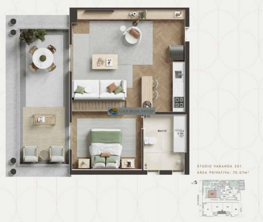 Sofisticação de morar em um studio com varandas confortáveis no estilo Art Déco.